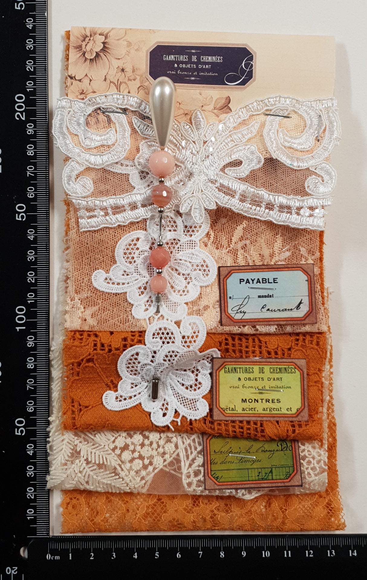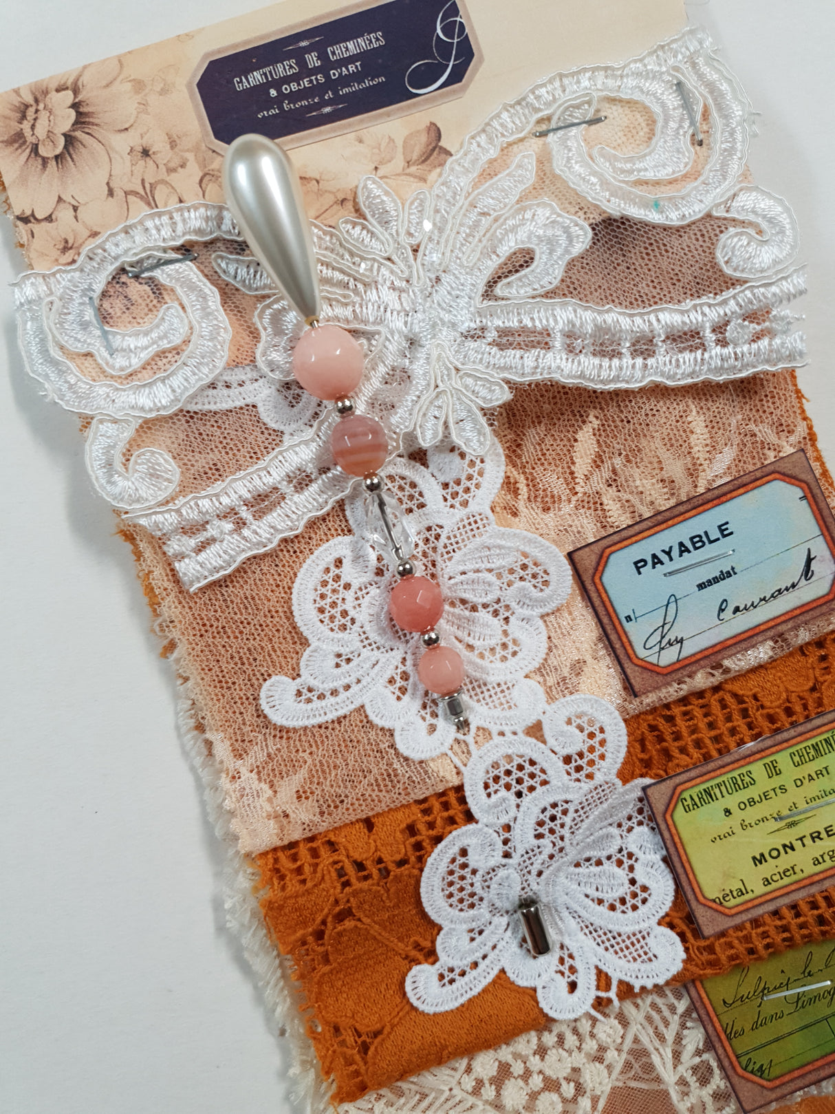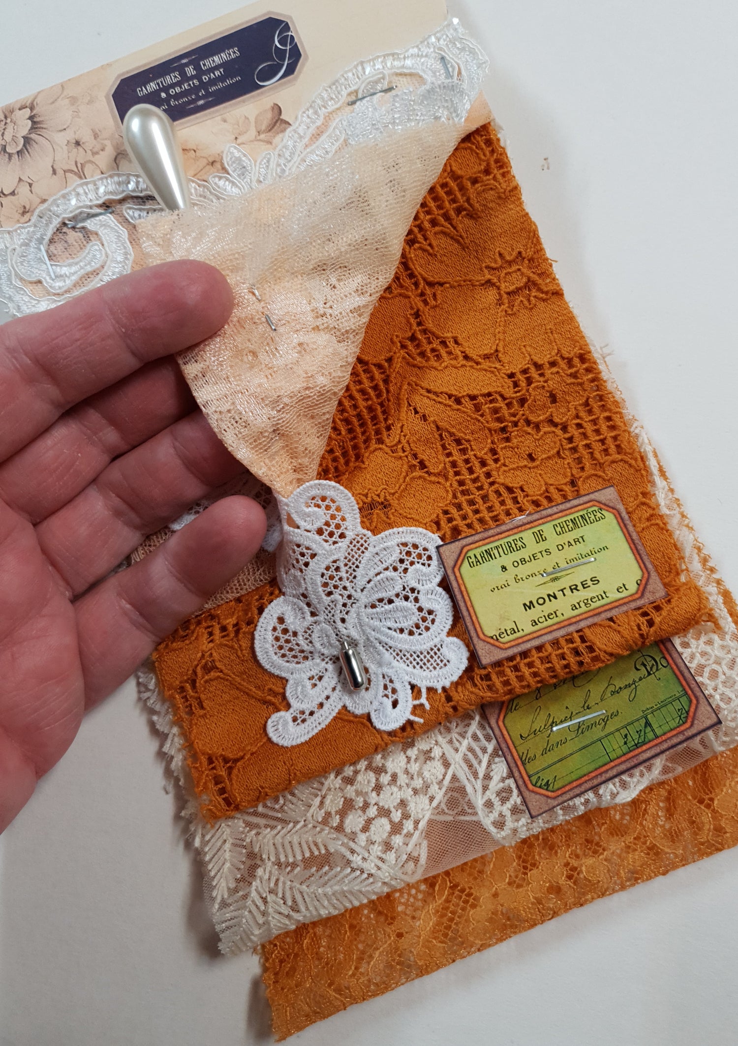 Pack includes 4 pieces of lace, 1 applique & Decorative Pin.