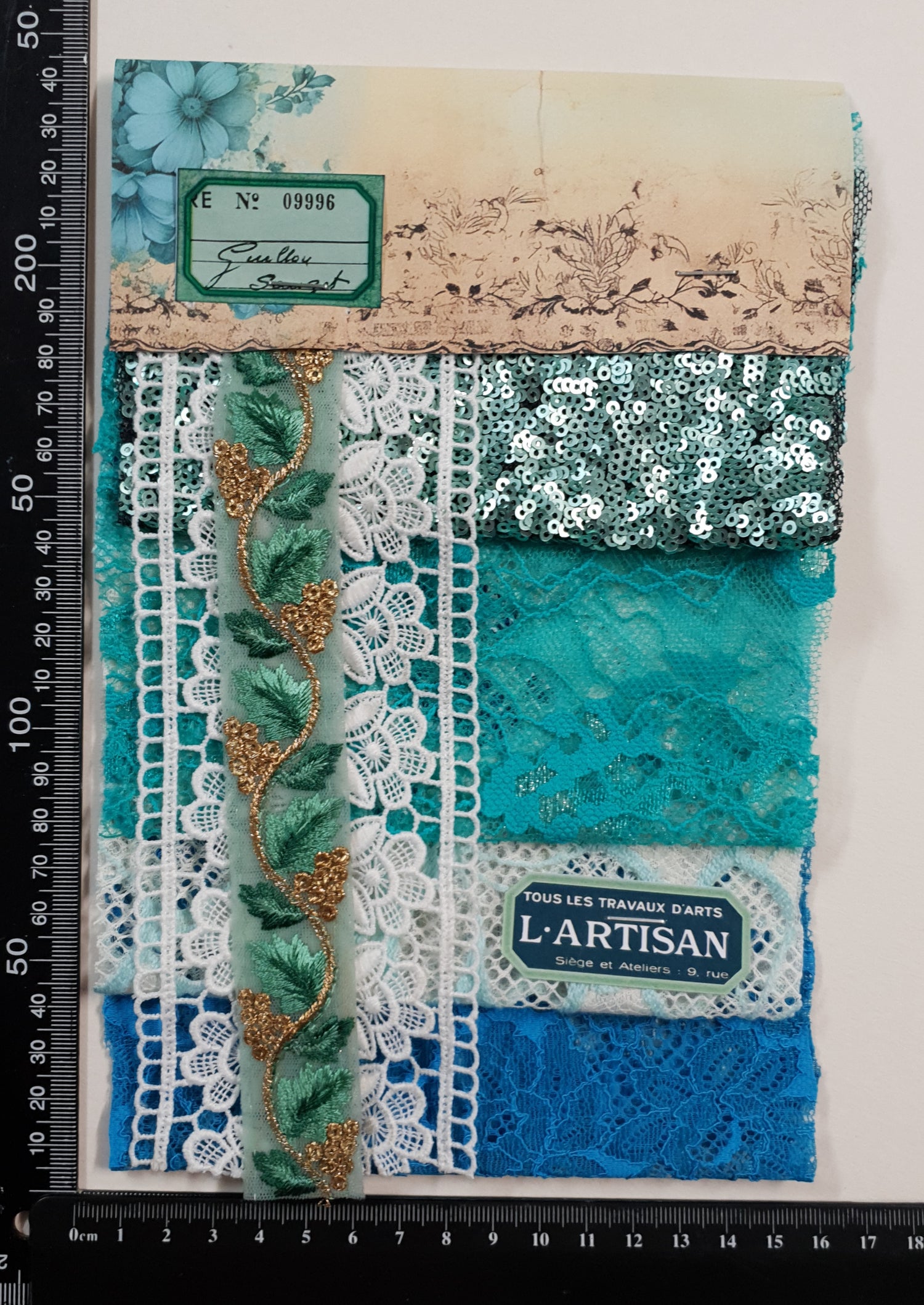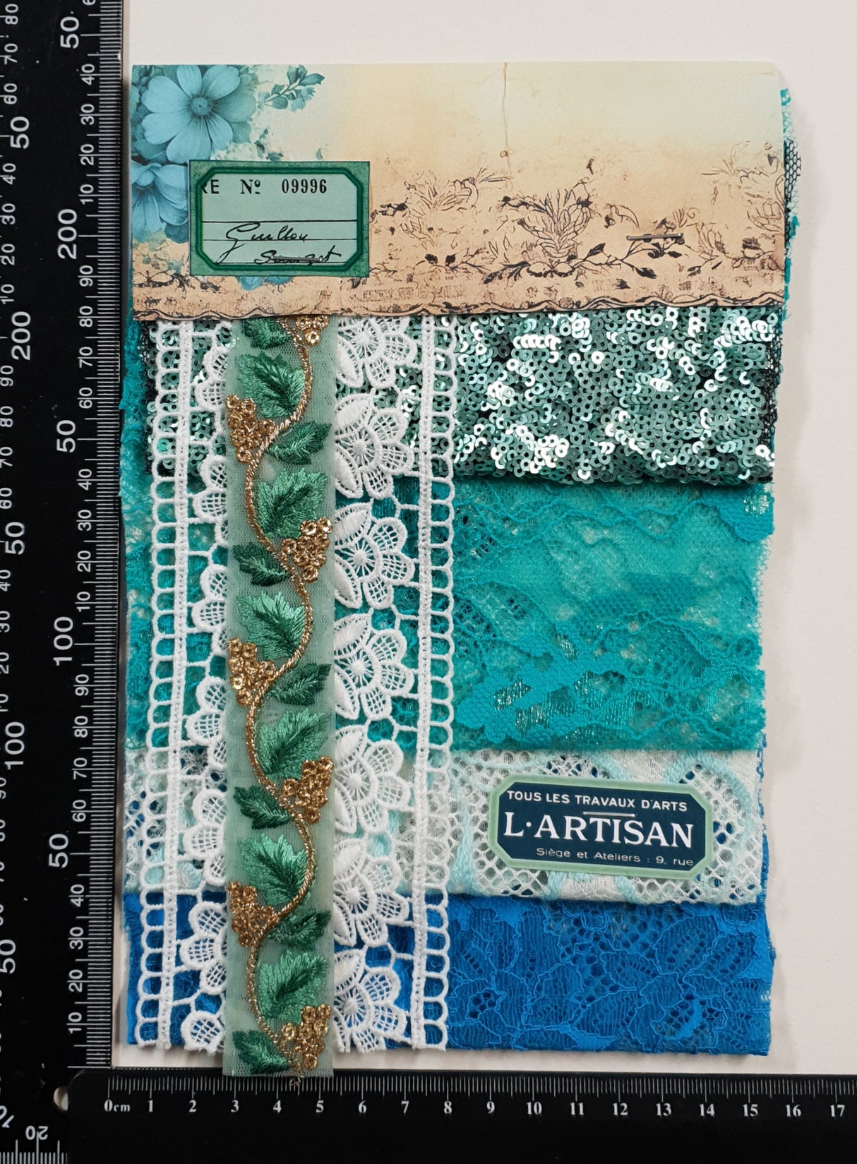 Pack includes 3 pieces of lace, 1sequin piece and 2 trim pieces.