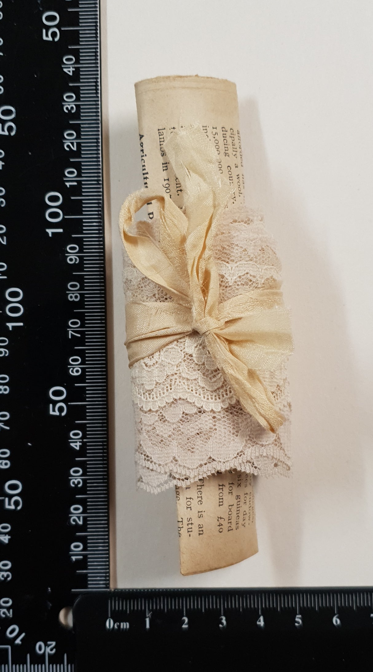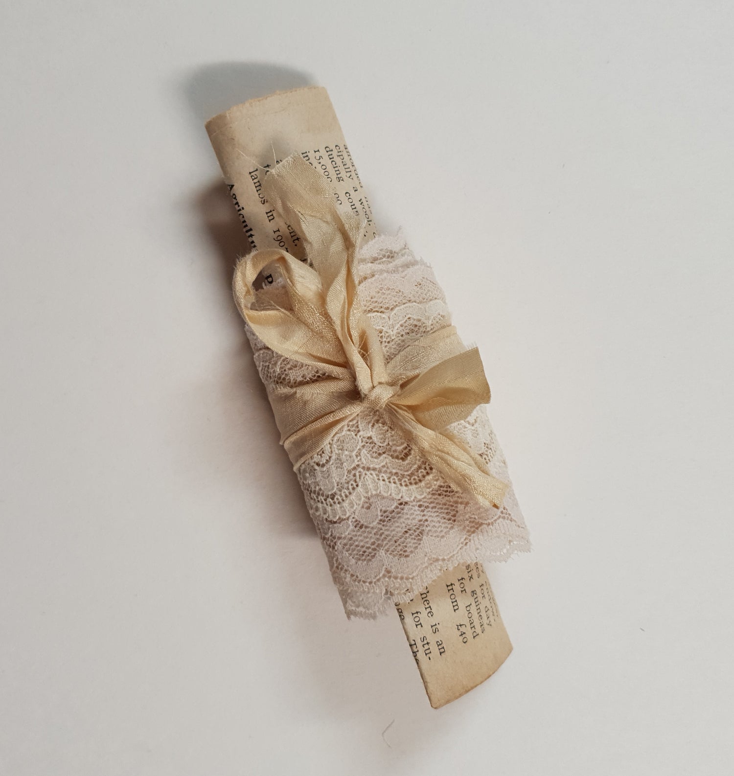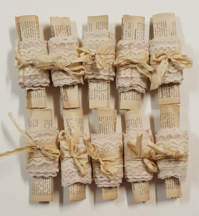 Sampler contains 1 book page. 2 x 1m lace and a label tied up with sari silk