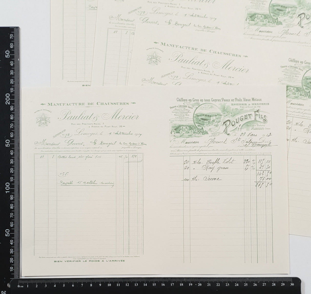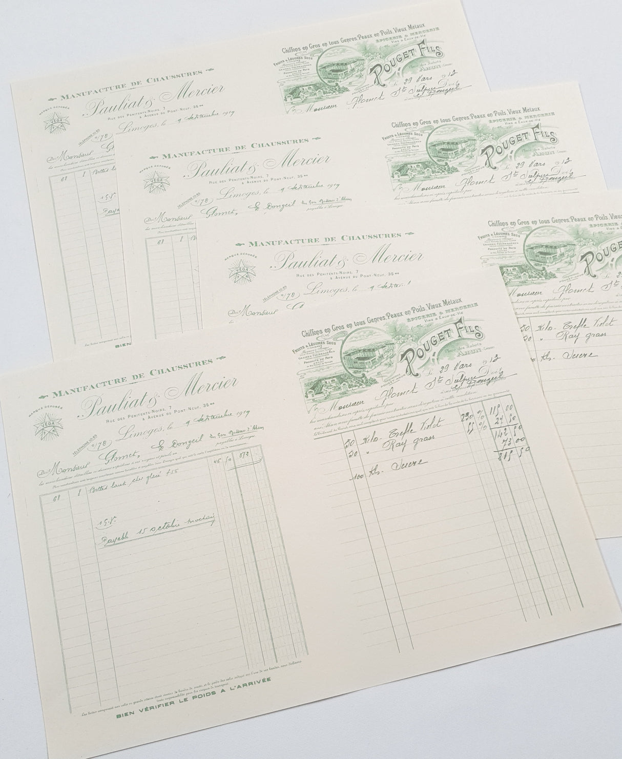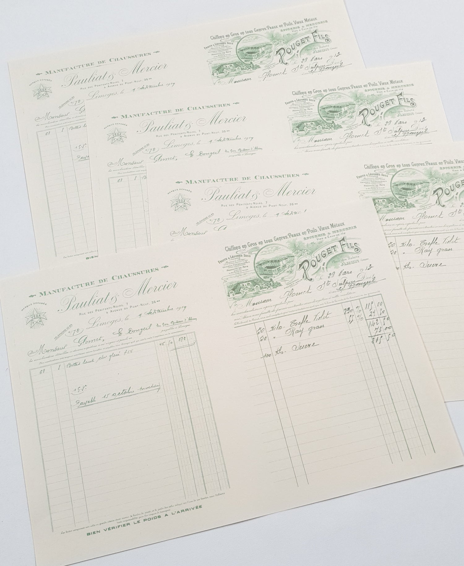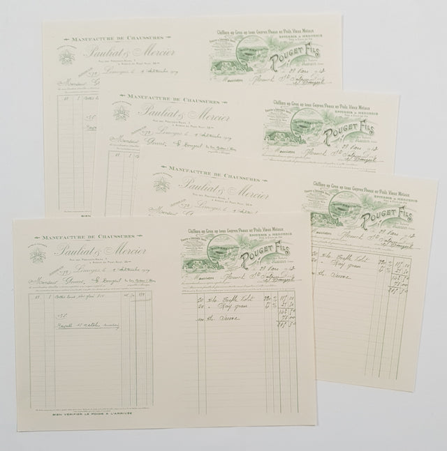 Set of 4 x A4 pages with 2 faux vintage invoices per page (8 x A5 invoices total) printed on 60gsm newsprint paper.